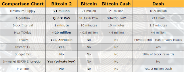 Why Bitcoin 2? Sending old Bitcoin can be more expensive than wire transfer and slow compared to other crypto currencies. Transactions can also be tracked. With all the battles about what to do, the big improvements on Bitcoin come slowly if at all. So Bitcoin 2 should be born. Bitcoin 2 solves the problem and is also fast enough to be accepted as a payment method by retail stores and grocery stores due to the SwiftTX feature.